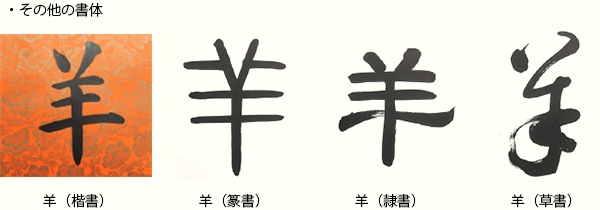 写真上の文字は金文と呼ばれ、中国紀元前の時代に青銅器に刻れるなどした文字で、漢字の原形です。よく見てみると、羊を正面から見たときの角と上半身の形をしています。下の文字は金文が変化し、現在も使われている楷書と呼ばれる書体です。
