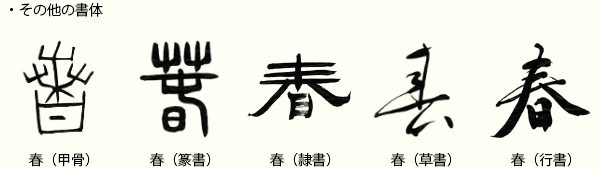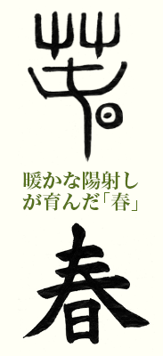 上の文字は「春」という漢字の金文で、自然が営む姿を象っています。「春」は、「艸」(くさ)+「屯」(チュン=草木の芽生え)+「日」(ひ=太陽)から成る形声文字(漢字の法則のひとつで、音と意味を組み合わせた文字)です。暖かな陽をいっぱいに浴びて若葉が顔をのぞかせようとしている様子を表したのが「春」という漢字です。