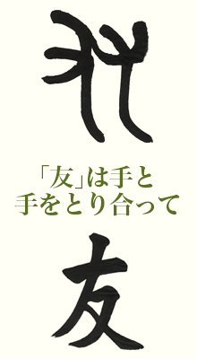 」で何かをとろうと手を伸ばした形をしています。その右手を二つ合わせると「友」になります。手と手をとり合って助け合う。それが「友」の意味です。このように二つ以上の文字を組み合わせて、新しい意味を表す字は会意文字といいます。