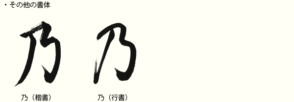 例として、「の」を見てみましょう。上の文字は「乃(の)」という漢字の草書体です。草書体は漢字の書体のひとつで、速く書くことができるように字画の省略が行われています。そして「ひらがな」は草書体をさらに簡略化したものです。