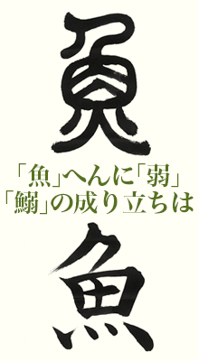 魚の種類を表した漢字の多くには魚へんが使われています。「鰯」(いわし)はうろこがはがれやすく、すぐに弱ってしまうために魚へんに弱いと書きます。「鮪」(まぐろ)の語源は、目が黒いことから「真黒」(まぐろ)。「鮪」という漢字の成り立ちを調べると、つくりの「有」には、「広い範囲を囲む」という意味があり、鮪が広い範囲を囲むように回遊する魚だから、という説があります。