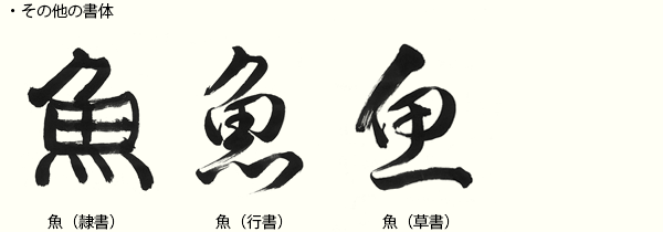 上の文字は「魚」という漢字の篆書です。下の楷書の4つの「点」は背びれを、真ん中の「田」はうろこを、上の「ク」は頭をそれぞれ表しています。