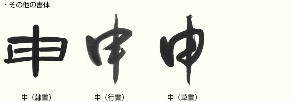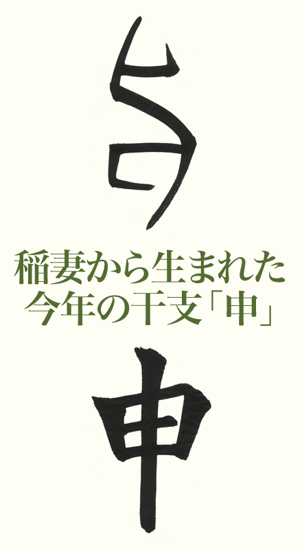 上の文字は、今年の干支である「申」の甲骨文字です。稲光を左右に並べ、稲妻の形を表しています。稲妻は天上の神さまが発するものと考えられており、本来の意味は、神さまの威光を表す象徴でした。