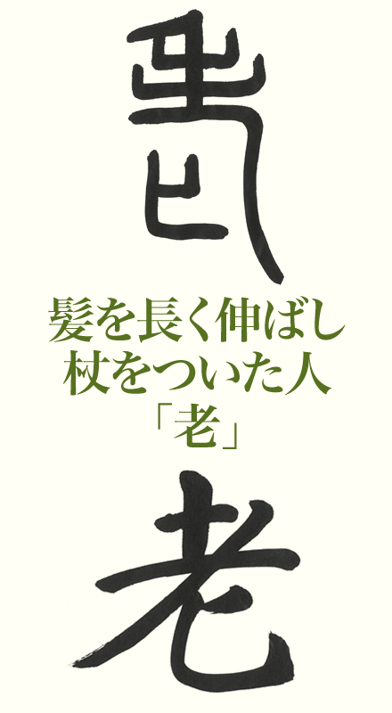 」と「ヒ」からできた文字で、髪を長く伸ばし背が曲がった人が杖をついて立っている形を表しています。「