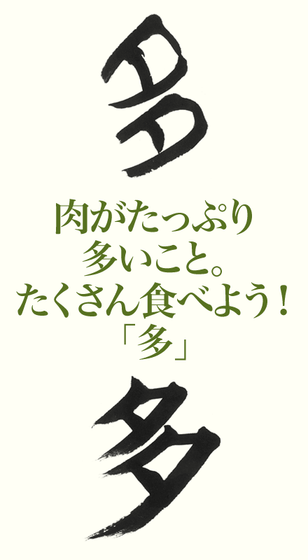 肉がたっぷり多いこと。たくさん食べよう!「多」
