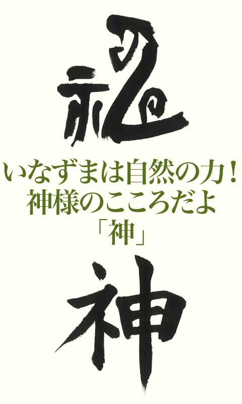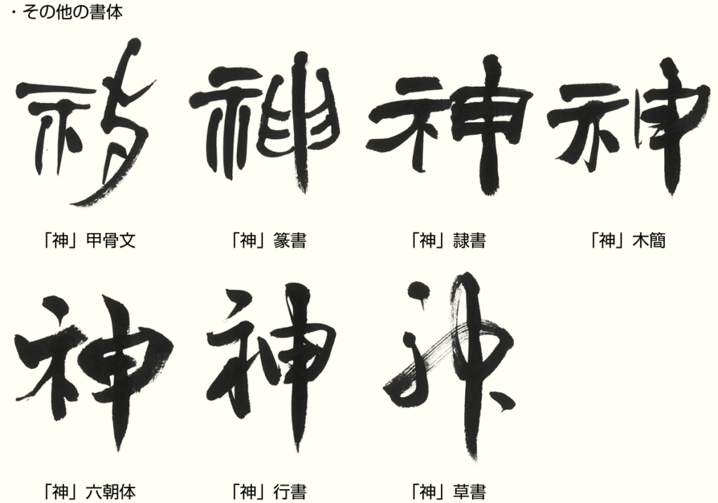上の字は、「神」の金文です。「神」の「申」は、いなずまの形を指して、「ネ」はもと、「示」と書き、神様を祭る祭だんのことだったんだよ。だから、「神」は、「ネ」(かみさま)と、音を表す「申」(いなずま)を合わせた字で、いなずまのように自然のふしぎな力や、目に見えない心の働きを指すようになったのです。