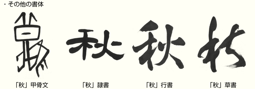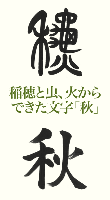 秋は、もとは「」ときました。みのったイネやアワなどの穀物こくもつが、こうべらした姿すがたの「)」と、イナゴやカミキリムシなどのかたちをした「(龜)」と、穀物をべるイナゴなどの害虫がいちゅうを、「火(れんが)」でき、豊作ほうさくいのったことからできた文字もじです。このようにひとつ一つの意味いみわせてできた文字を、「かい文字」といます。のちに「」は、「亀」を省略しょうりゃくし「秋」となり、実りや季節をあらわすようになりました。