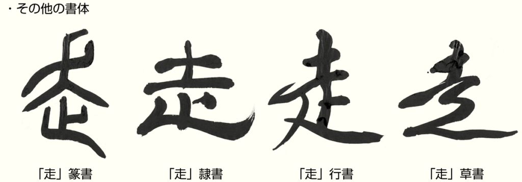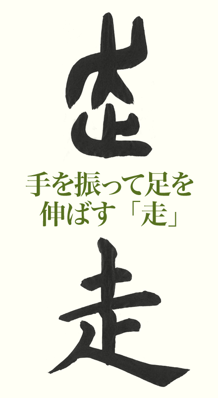 「走」は「」と「」からできた文字もじひとかたちで、あしです。手をぜんおおきく振ると、足がにすっとび、びます。まさに走ることの意味いみ直接ちょくせつあらわしている文字とえるでしょう。競走きょうそう走破そうは走狗そうく中国ちゅうごくでは狗はいぬの意味です)などと使つかいます。