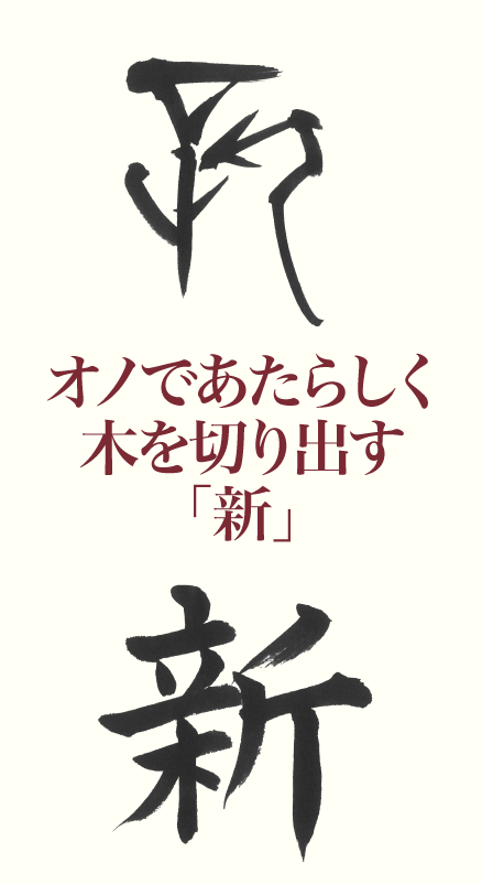 」といい、選んだ木を「斤」で切った形から「新」という字が生まれた。あたらしく木を切り出したことから、「あたらしい」「あらた」を意味する漢字になったんだね。