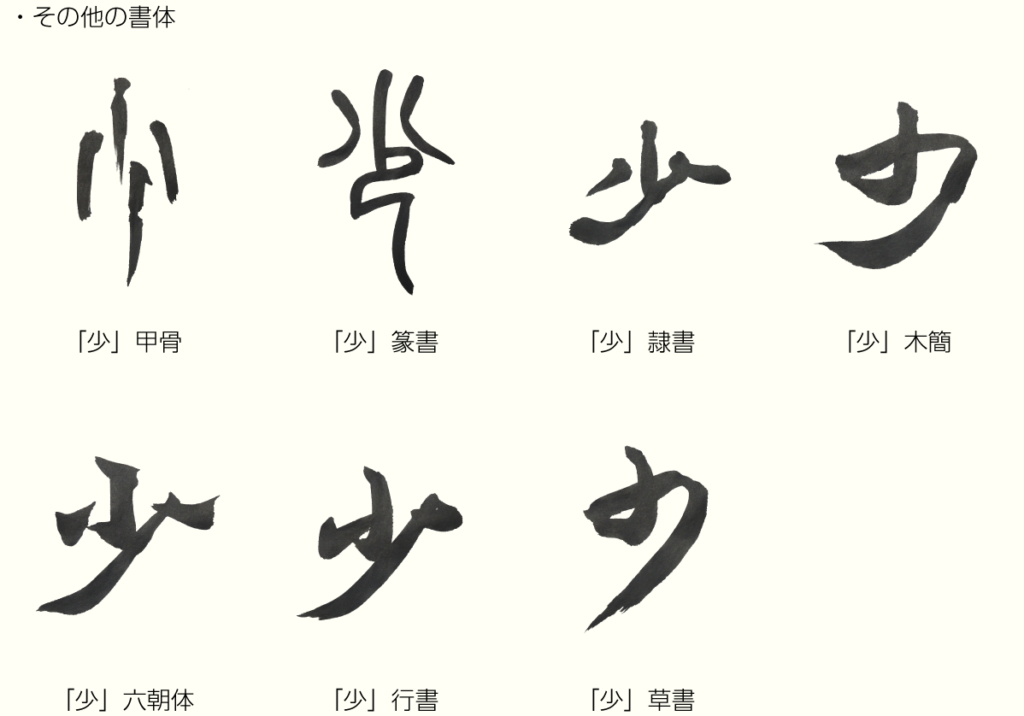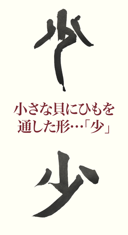 左の金文を見ると、「小」が貝や宝石がバラバラに散乱している形で、それに「ひも」を通してつづった形が「少」なんだ。数が少ないので、すこし・すくない、の意味になり、それを人に当てはめて、少年・年少・少数など、わかい・おさないなどの意味でも使われるようになったよ。