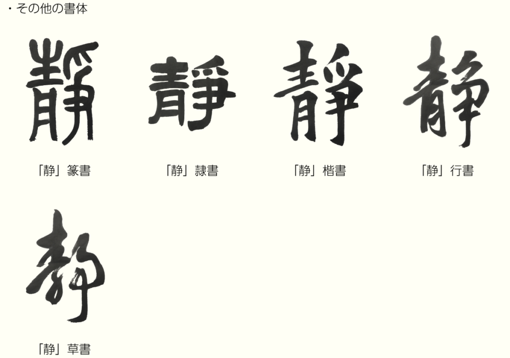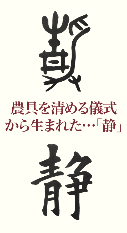 「静」という文字は、青丹で耜を清め祓う儀式を表わす文字だったのです。儀式によって穀物の収穫が「安らか」であることを願ったので、「しずか」の意味にもなりました。