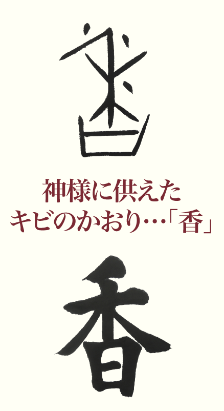 神様へのお供えは、香り高いものが第一と考えられ、穀物の中で最もおいしく高級で香りが良い黍を、実りへの感謝をこめて供えました。炊き立てのご飯の香りを思い出すと、よくわかりますね。これこそ嗅覚に訴えた「香」の意味だったのです。今も炊き立てのご飯を一番に神様に供える風習が残っています。人が神様に感謝する行為は、今も昔も同じなのですね。