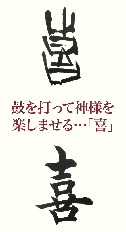 左上ひだりうえ甲骨文字こうこつもじてください。からなり、打楽器だがっき象形しょうけい祝詞のりとれるうつわかたちで、神様に祝詞をささげ、つづみってたのしませるという意味いみになります。つまり、御神楽おかぐらのことで、当初とうしょは、ひとがはしゃいでよろこんだり、わらったりするということではなかったのです。