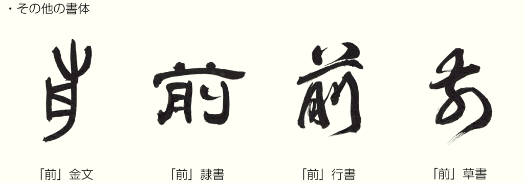左上の文字は、「前」の古代文字(篆書)です。分解すると「止」と、「舟」と「刂」が組み合わさってできているのがわかりますね。「止」は、「前へ進む足」を表し、「舟」は「渡し船」、「刂」は「刀」(切りそろえる)を表しています。