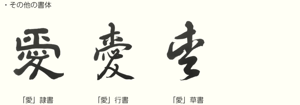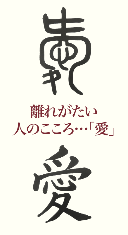 は足跡を意味します。つまり、「愛」はその場所を離れがたい、ひそかな心を表しているのです。そこから、「愛しむ」「愛する」などと使用されるようになりました。