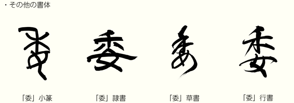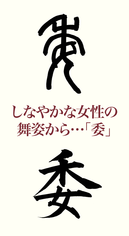 この「低い姿勢でしなやかに舞う女性」から転じて、「委」は、「力がない」ことを表すようになり、「ひくい・したがう・ゆだねる」などの意味がうまれました。