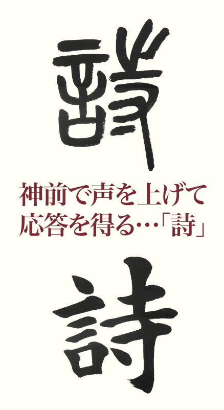 (サイ)をたたいて、祈り訴えることをあらわすように、「詩」は、神前で声を上げて「うた」をうたいあげることにより、神の応答を得るのが目的でした。
