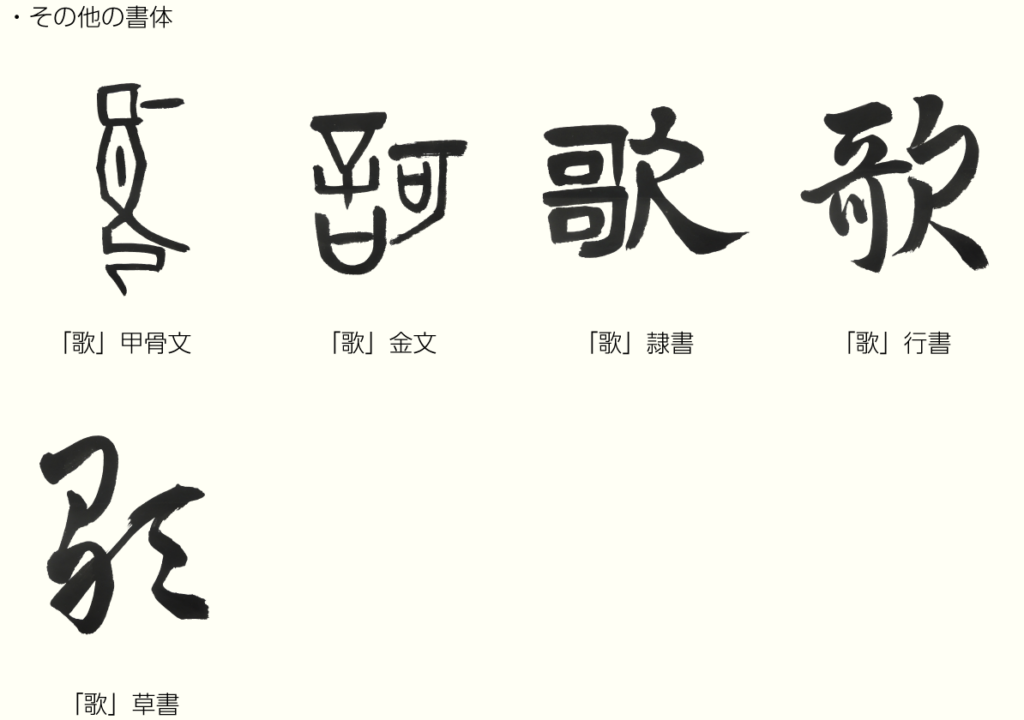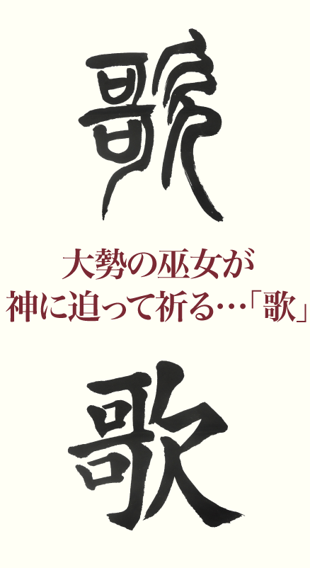 「可」は、えだかたちうて)と、神様かみさまへのねがごといたものをれるうつわ)をわせたもの。「可」をかさねた「哥」は、複数ふくすう意味いみで、多数たすう巫女みこが、願い事がかなえられるよう神にせまっていのることをあらわしています。