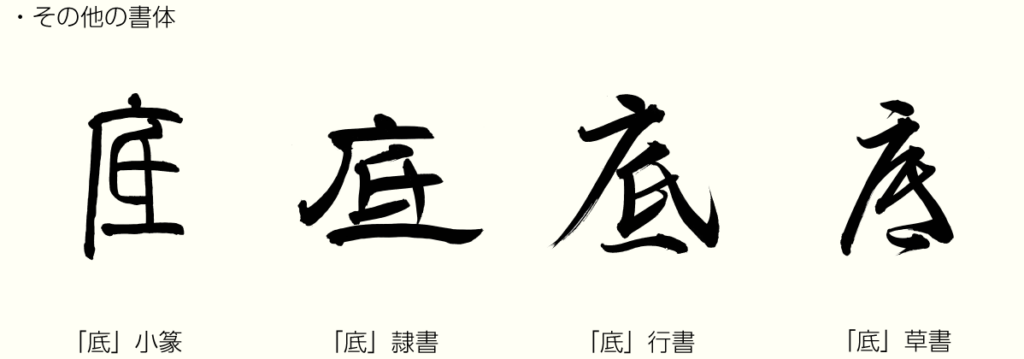 「底」は、建物の底を表した文字です。底の字を分解すると、「广」+「氐」ですね。「广」は「建物の屋根の形」、「氐」は「小刀で底を削って平らにすること」を意味します。それらを組み合わせて、「建物の設営のときに地を平らにして固めること」を示すようになりました。