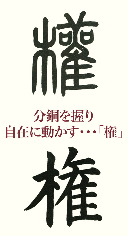 「権」はおもり、物をはかる、謀りごと、つりあい等の意味があります。左の篆書を見てわかるとおり、「権」は