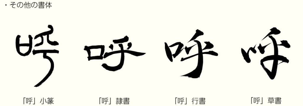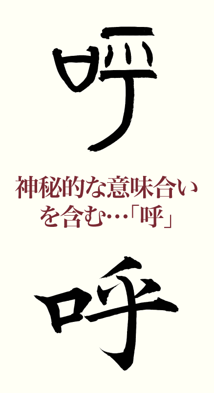 「体から声を出して叫ぶ」という意味ですが、以上のような成り立ちから神秘的な意味合いがあり、「呼応」(呼びかけに応えること)、「呼称」(名をつけて呼ぶこと)、「呼吸」(息を吸ったり吐いたりすること)などと使います。