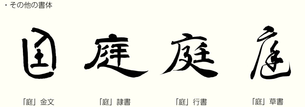 天皇・国王の居所を「宮廷」、天子が政治を行う所を「朝廷」、裁判を行う場所を「法廷」と言いますね。こうした背景から、「庭」には「物事の行われる場所」「神事・行事などの行われる場所」の意味も含まれます。興味深いと思いませんか。