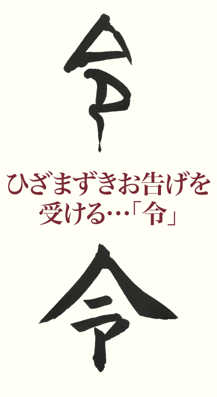 」。儀礼用の帽子(礼帽)をかぶって神様の前にひざまずき、お告げを受ける人のかたちをしているんだ。神様のお告げ(命令)が「令」の元々の意味で、「令」に口(