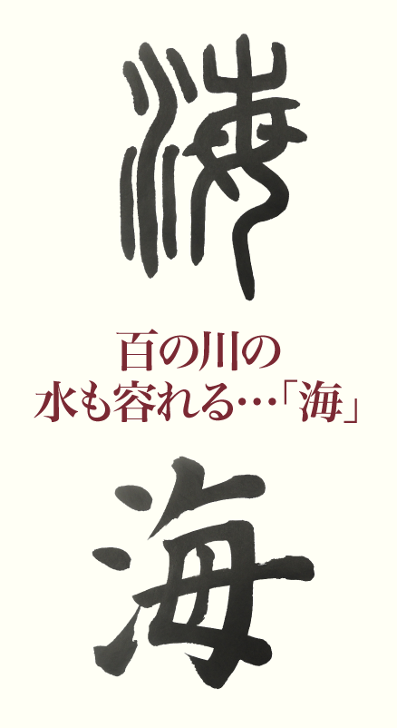 「海」は左の篆書を見るとわかるように、偏に、意味を持つ「水」と、旁に音を持つ「毎」をあわせてできた形声文字です。百の川の水も容れる大きな天の池のことで、音は、「マイ」から後に「カイ」に変化しました。