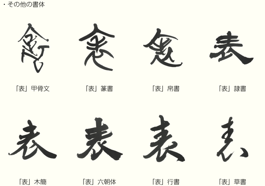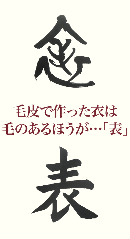 上の金文を見ると、「衣」の間に「毛」があることがわかるね。この「毛」は動物の毛皮のことで、毛皮で作った衣服は、毛のある方が「表」で、ない方が「裏」とされたんだ。そこから、「おもて、あらわす、あらわれる」の意味になり、「年表」「表紙」「表現」「表門」などと使うようになったんだ。