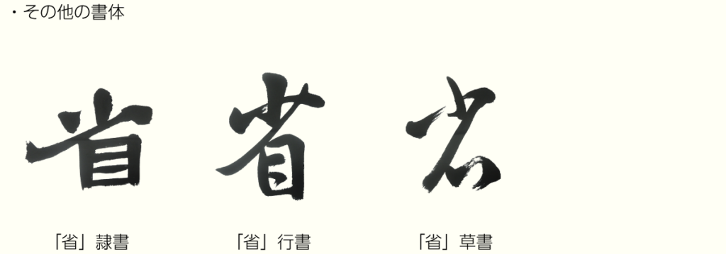 「省」は「生」と「目」の形成文字(音を表す部分と、意味を表す部分を組み合わせた文字)です。
