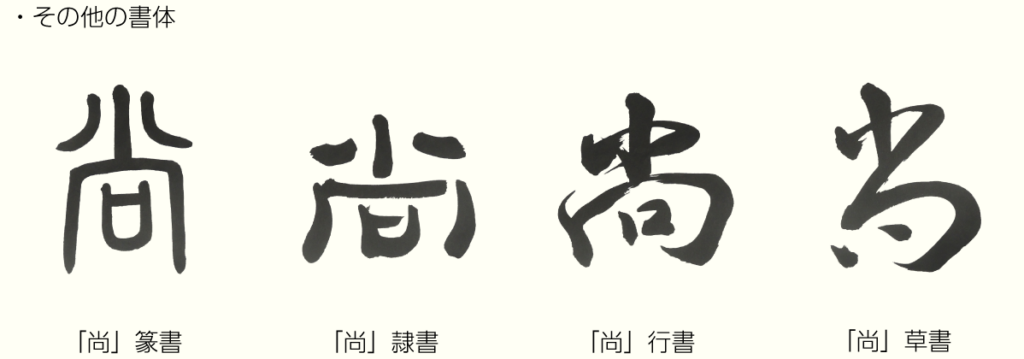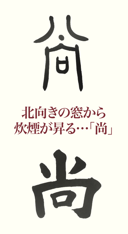 そこで、今日きょうは「尚」というげます。趣味などが上品じょうひんな「高尚こうしょう」、たっとぶ「好尚こうしょう」などと使つかいますね。「尚」は、ひだり金文きんぶんをみてわかるように、「はち」と「しょう」からできた会意かいい文字もじです。きた向きの高窓たかまどから炊煙すいえんのぼることをあらわします。