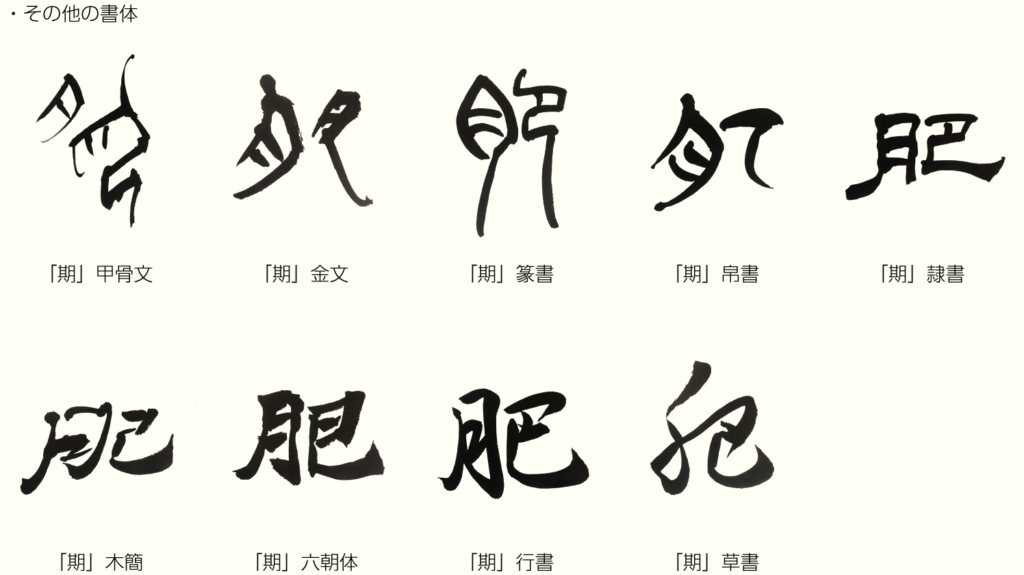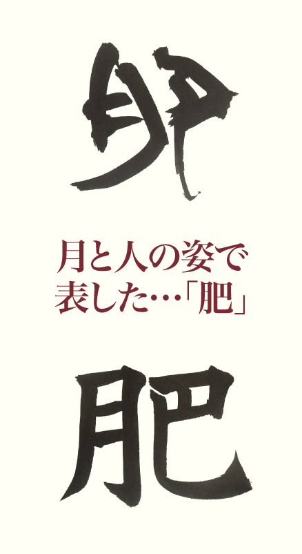 上うえの金文きんぶんを見みてみよう。左ひだり側がわの「月つき」は、先週せんしゅう出でてきた「空そらに浮うかぶ月つき」ではなく、「にくづき」と言って人ひとの体からだの一部いちぶを指さすんだ。右みぎ側の「巴は」は、ひざまづくと太ももの辺あたりが太くなるように見える形かたちから、「ふくらむ」の意味いみがある。だから「肥」は、月と人の姿すがたで「太る」「太らせる」の意味に使つかわれるんだ。