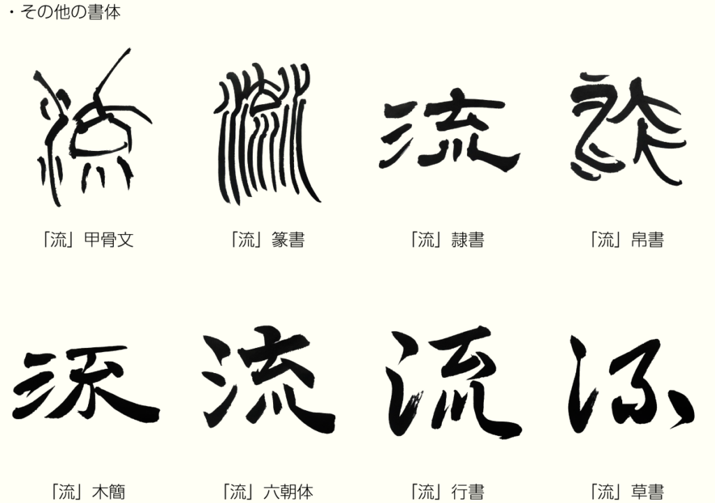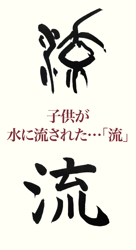 水だけでなく、ものの流れ(流つうでん流)や、かれること(ぶん流、流)、やりかた(流いち流)の意味でも使つかわれる。来年らいねん五輪ごりん期間中きかんちゅう、外国人の方と漢字文化かんじぶんかこう流をして、自己じこ流でもふう流な字だねってわせたいね。