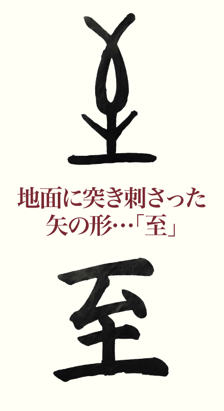 かならずここまでいたる、という意味の「ひっ至」、これ以上いじょう飛べないときわまった「至ごく」、一年中いちねんじゅうもっとながい「至」、日のみじかい「冬至とうじ」などと使つかわれました。