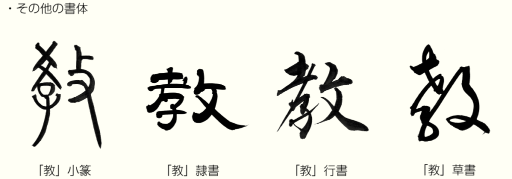 教の旧字体は「敎」です。「敎」を分解すると、「爻(こう)」+「子(し)」+「攴(ぼく)」です。「爻」は「交わる」、「子」は「両手」、「攵(攴)=ぼくづくり」は「動作」を表し、「先生が生徒と交わること」、つまり、「先生が生徒に教える」という意味が生まれたとされております。また一説には、「爻」は「神聖なる建物」を表し、そこに「子弟を集めて教育を行った」ことから、「教える」という意味が生まれたとされています。