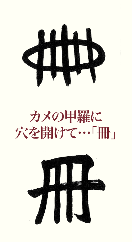 冊という文字を取り上げます。木ヘンをつけた「柵」のもともとの文字です。数本の不揃いの棒がまっすぐに立っています。これは亀甲を横から見た形です。楕円は亀甲に穴をあけて紐を通し束ねたことを示しています。