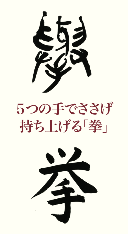 今回こんかいから手がたくさんあるあつかうよ。ってるひとは手をげて! そう、ずは「挙」。もとの字は「きょ」、金文きんぶんでは「」とたくさんの「手」のわせだね。与は2ほん象牙ぞうげかたち)でみ合った様子ようすあらわしているね。上側うえがわの()はしたりょう手。下()は上を向く両手で、この4本の手でささえ、さらにその下の手()で全体ぜんたい(与)をたかげている。だから、「あげる、ささげる」の意味いみになった。両手で協力きょうりょくして持ち上げるから(みな、ことごとく)とも使つかわれるんだ。