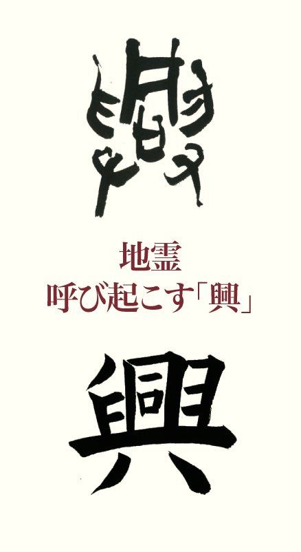 それを上の両手()で持ち、さらに下の両手()がささえているよ。古代中国のしゅう時代(紀元前きげんぜん1046年ごろ~同256年)には各地かくちの王が集まり、(同)筒形の酒を使った式(会同かいどう)をよくやっていたよ。同の中には神へのいのりを意味する(サイ)があるから、「興」は酒が入った同を人々が協力きょうりょくして持ち、大地に酒をり注ぎ、地霊ちれいび起こす儀礼を指すんだ。
