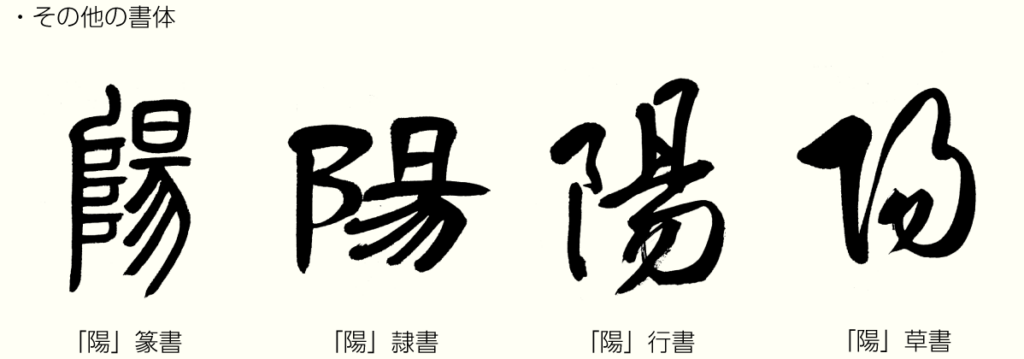 左上の「陽」の金文は、神霊しんれいが天と地を上り下りする梯子はしご)・霊力れいりょくを持つぎょく)・(玉をのせる台)・(玉の光が下に向かって放射ほうしゃする形)―からなっています。