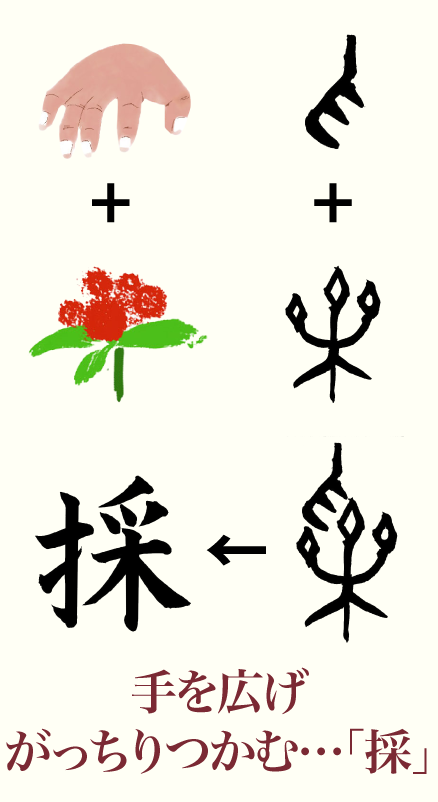 元となった「采」をくわしくみてみましょう。「つめ」と「木」からなっています。「爪」は、クレーンゲームのように上から手を広げて、物をつかもうとする形です。甲骨こうこつ文字では上から手を広げて、草や木の実などをみ取っているのがわかります。その後「扌」が加えられ、この字はさらに進化し、たんに「取る」とか「取り上げる」という意味いみで使われ、「租税そぜいを採る」、「採決する」、「採血する」などとはば広い使い方がされるようになりました。