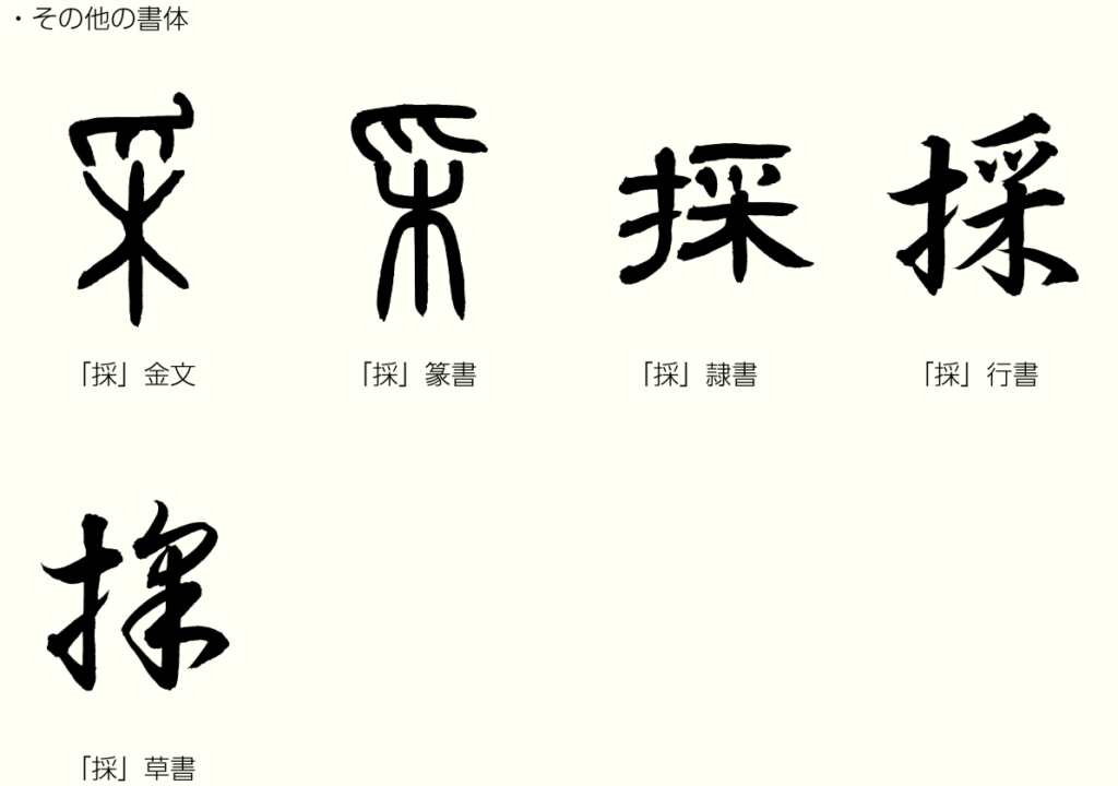 「扌」と「采」からなっていますが、「采(さい)」という字が元になって草書が完成かんせいしたころに「扌」を加えて作られた字です。ですから、「採」には篆書てんしょがありません。