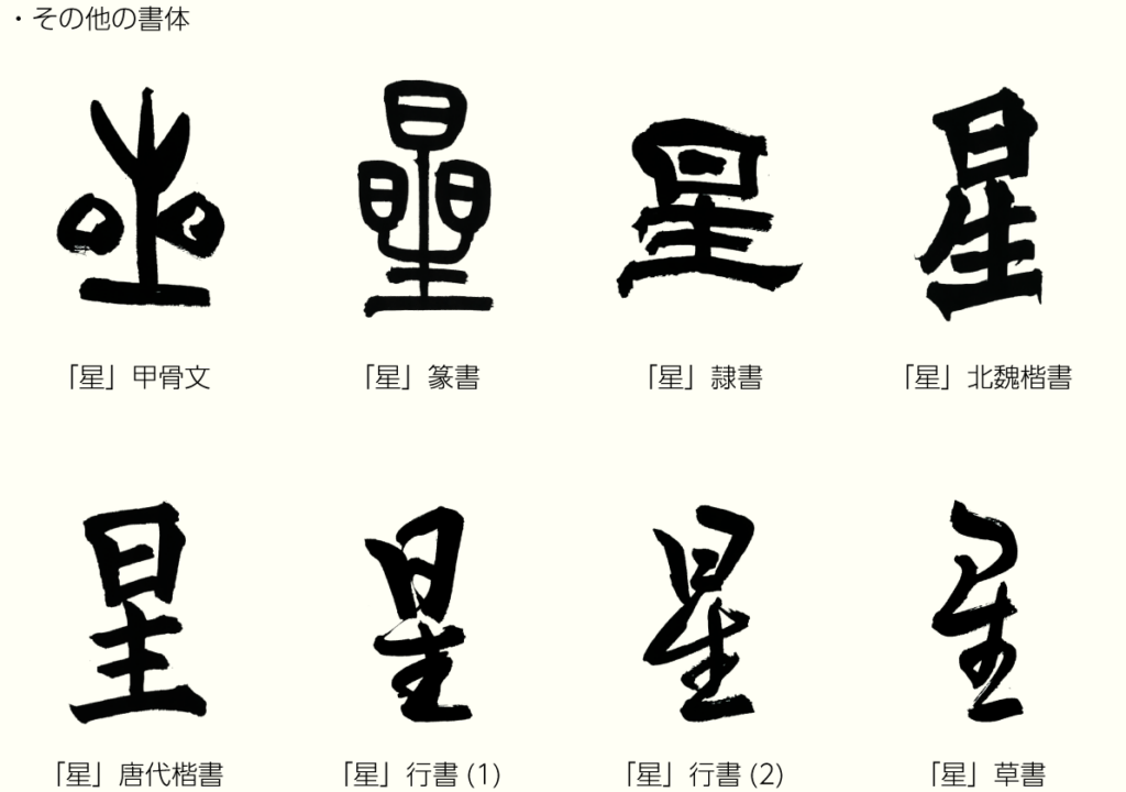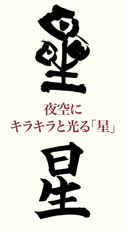「星」という漢字は「晶」と「生」が上下に組み合わさって、旧字体の「曐」と なり、さらに上部の「晶」が「日」に省略されたのです。
