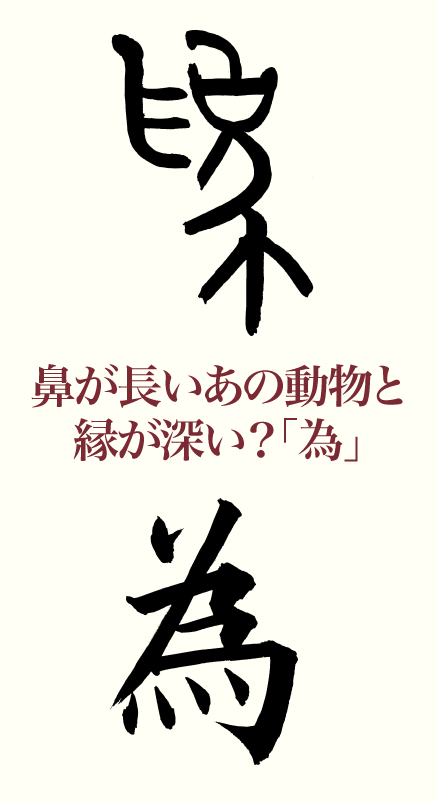 動物園で人気の象。童謡「ぞうさん」(まど・みちお作詞、團伊玖磨作曲)の「ぞうさん ぞうさん おはなが ながいのね…」の歌詞を思い出します。今回はそんな象にもまつわる漢字「為」についてみていきます。