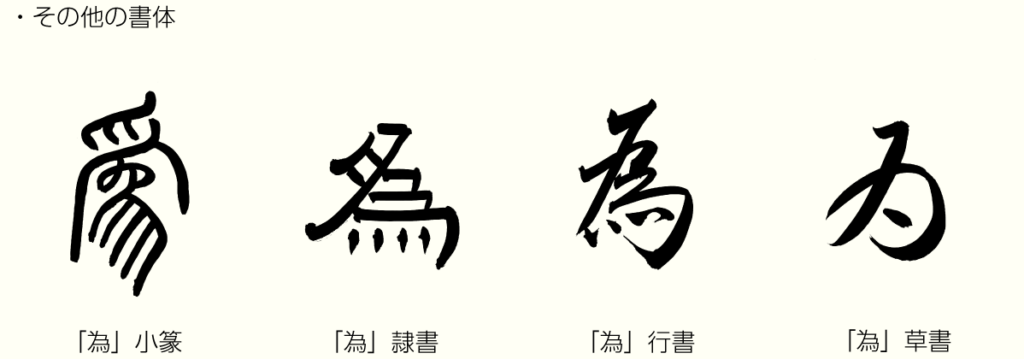 「為」の金文の書を見てみましょう。左上(偏)は「手」の形、右(旁)は「象」の形を示しており、この字は「象を飼いならすさま」を表現しているとされております。古代では宮殿を造る際に、象を使って作業する場合もあり、「土木工事などをする」といった意味に転じました。さらにそこから「実施する」を意味する「為」という漢字が成立したとされております。