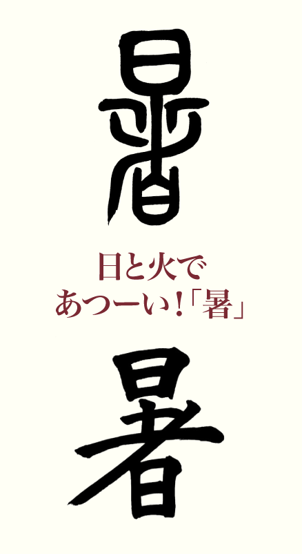 さて、今回は「暑」という文字です。音は「しょ」、訓は「あつ」いです。「日」の持つ意味と「者」とを組み合わせた文字です。日はもちろん太陽を表し、者は元の意味は火を燃やすことで、「