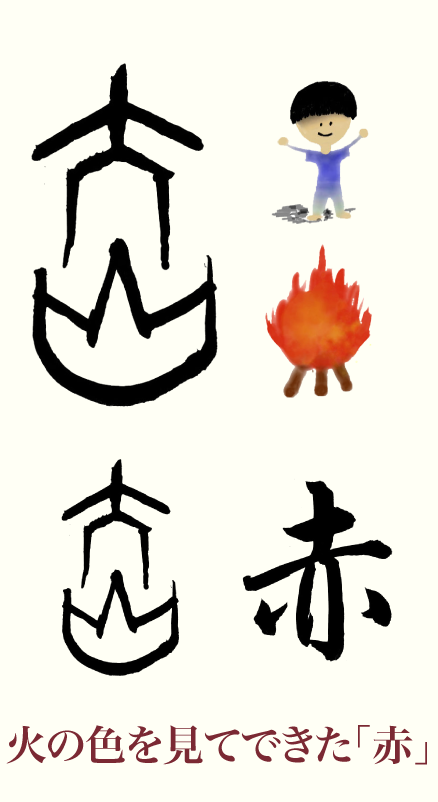 「赤」という字は、人が手を広げて立っている様子と火が盛んに燃えているところを合わせた字です。火をみて古代の人たちはその色を「赤」と名付けました。また、火の前に立って光を浴びている姿ともいえます。これは、火の光を浴びることで災いや害から防ぎ清める役目を果たしていたと考えられます。これが発展して「赤」という字は「あきらか」、「まこと」という意味にも使われるようになりました。