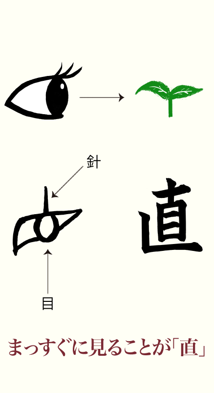 」は、ずっと後になってから付け加えられたもので、おおいかくすという意味。「十」は数字とは無関係で、古代の針の形を表したもので、「まっすぐ」という意味になります。よって「直」は目で真っすぐ見ることをいい、少しのずれを目測でまっすぐにすることから「なおす」という意味へ発展していきました。