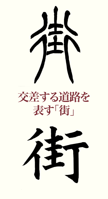 この字は、十字路を表す「行」と「土」を盛り上げた区画を指す「圭」が合わさってできています。区切りをつけた街並みや交差する大きな道にことを意味します。