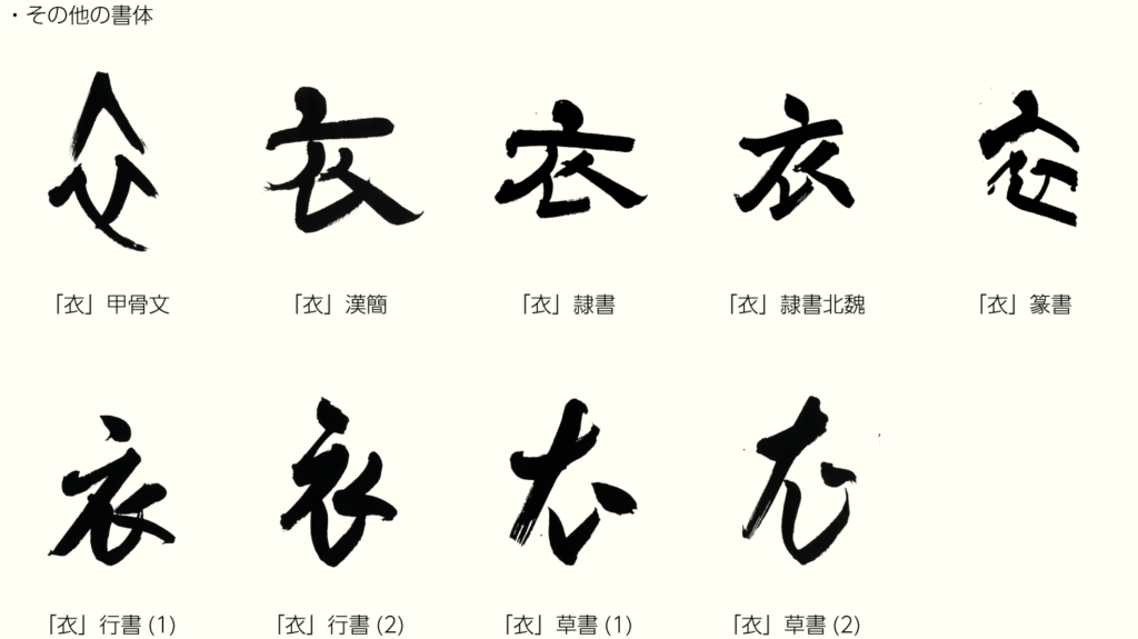 古代中国では、「衣」に人の霊力が宿っていると考えられ、それを受け継ぐ意味の文字に「衣」が多く含まれています。