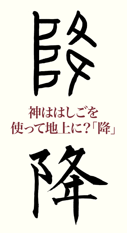 「降」は、「阝(こざとへん)」+「夅(こう)」になります。「阝」は、天上の神が、地上との間を昇り降りするときに使う「はしご」の形を表しています。一方、「夅」は、「夂(ふゆがしら)」の下に「ヰ」を置いた字形に分解されます。「夂」は下向きの足。「ヰ」のほうも実は下向きの足を表します。よって「夂」と「ヰ」で下向きの左右の両足を指して、「夅(下向きに降りる)」という意味を含みます。